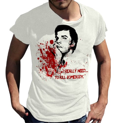 als überzeugter Dexter-Fan brauchte ich dieses Shirt einfach!das Shirt ist klassisch geschnitten, der runde Halsausschnitt ist nicht so weit, wie auf dem Foto mit dem weißen Shirt zu sehen ist, sondern eher enganliegend!, was man wiederum besser auf dem anderen Bild mit dem grauen Shirt erkennt! mir ist der enganliegende Rundhals eh lieber! wie gesagt: ein klassischer Schnitt!die Qualität ist gut und man kann daran nichts aussetzen. mehrere Wäschen hat das Shirt schon überstanden und es sieht aus wie am Anfang!das Besondere am Motiv ist natürlich erstmal das bekannte Profil von Dexter! und dann natürlich der provokante, rote Schriftzug (für nicht-Dexter-Fans sicherlich irritierend): I really need to kill somebody ... wirkt vielleicht auch etwas abschreckend oder seltsam für andere, die mit Dexter nicht vertraut sind ... aber für Dexter-Fans natürlich ein Outing! und es soll ja mehr da draußen geben ...die "Blutspritzer" sind einfach genial und noch besser als erwartet. sie sind unterschiedlich gefärbt und verschieden im Rotton. sie sehen nahezu echt aus! also fantastisch und ein echter eyecatcher!das Shirt läuft als "Herrenshirt" ... ich bin kein Mann, trage das Shirt aber trotzdem mit Begeisterung! Ladies, die bei Damenkleidung ein L nehmen, können die gleiche Größe hier auch kaufen. so habe ich es zumindest gemacht! sitzt halt locker und lässig.Fazit: das Shirt ist qualitativ hochwertig mit einem originellen Motiv, die Blutspritzer wirken echt! dieses Dexter-Shirt ist ein Statement!